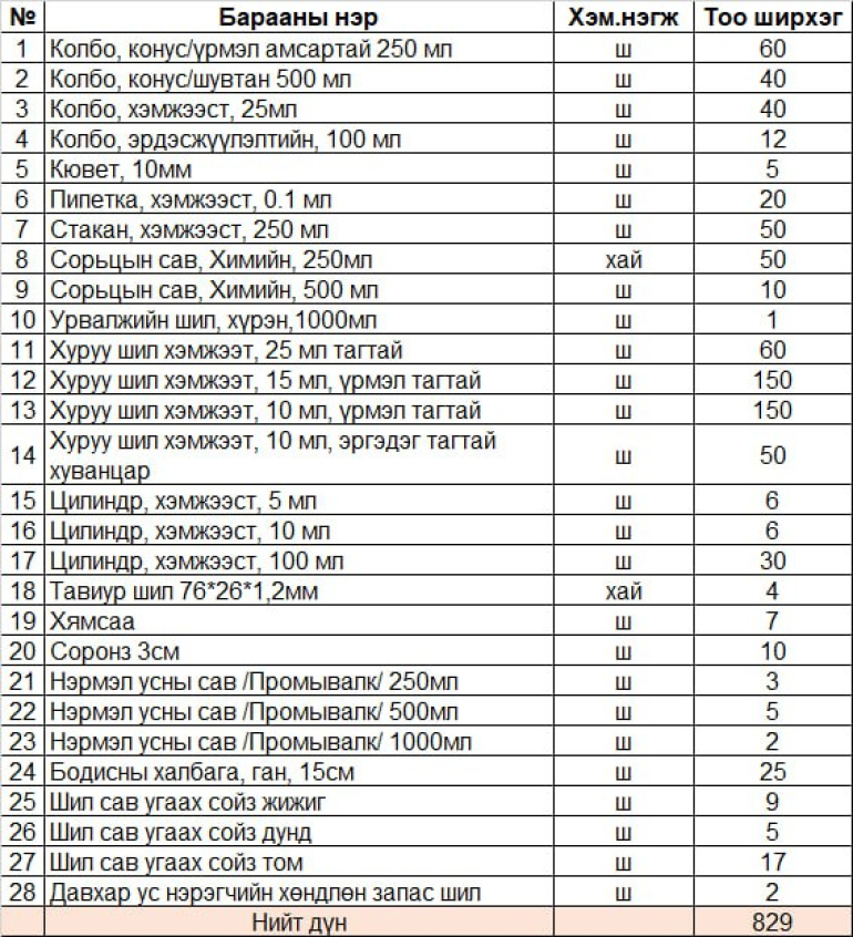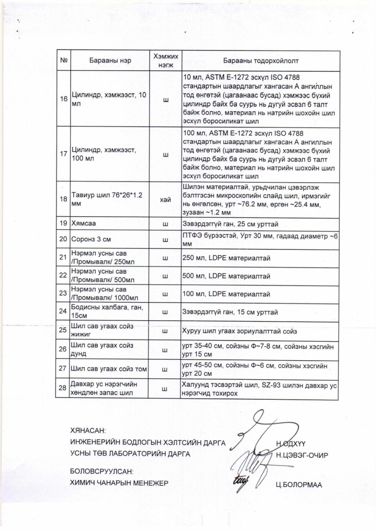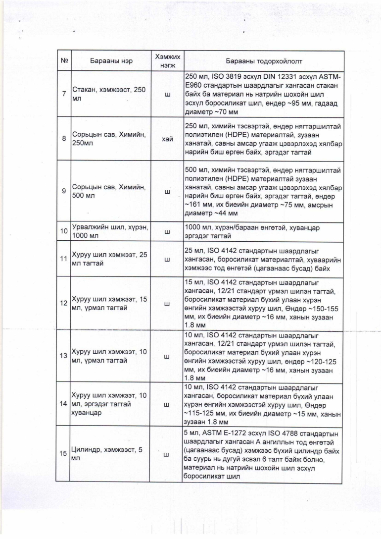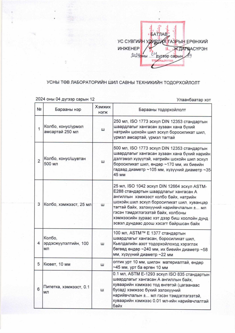 Дээрх техникийн тодорхойлолтын дагуу Усны төв лабораторийн хэрэгцээнд зориулж доорх тоо хэмжээгээр лабораторийн шил сав худалдан авах. Техникийн тодорхойлолтын дагуу тухайн барааг нийлүүлэх тухай үнийн санал болон холбогдох мэдээллийг 2024 оны 6 дугаар сарын 6-ны өдрийн 17 цаг 00 минутаас өмнө доорхи хаягаар ирүүлнэ үү. Хүлээн авагчийн нэр: Хангамжийн хэлтэс, Сонгон шалгаруулалт хариуцсан мэргэжилтэн Р.Батсүрэн,
