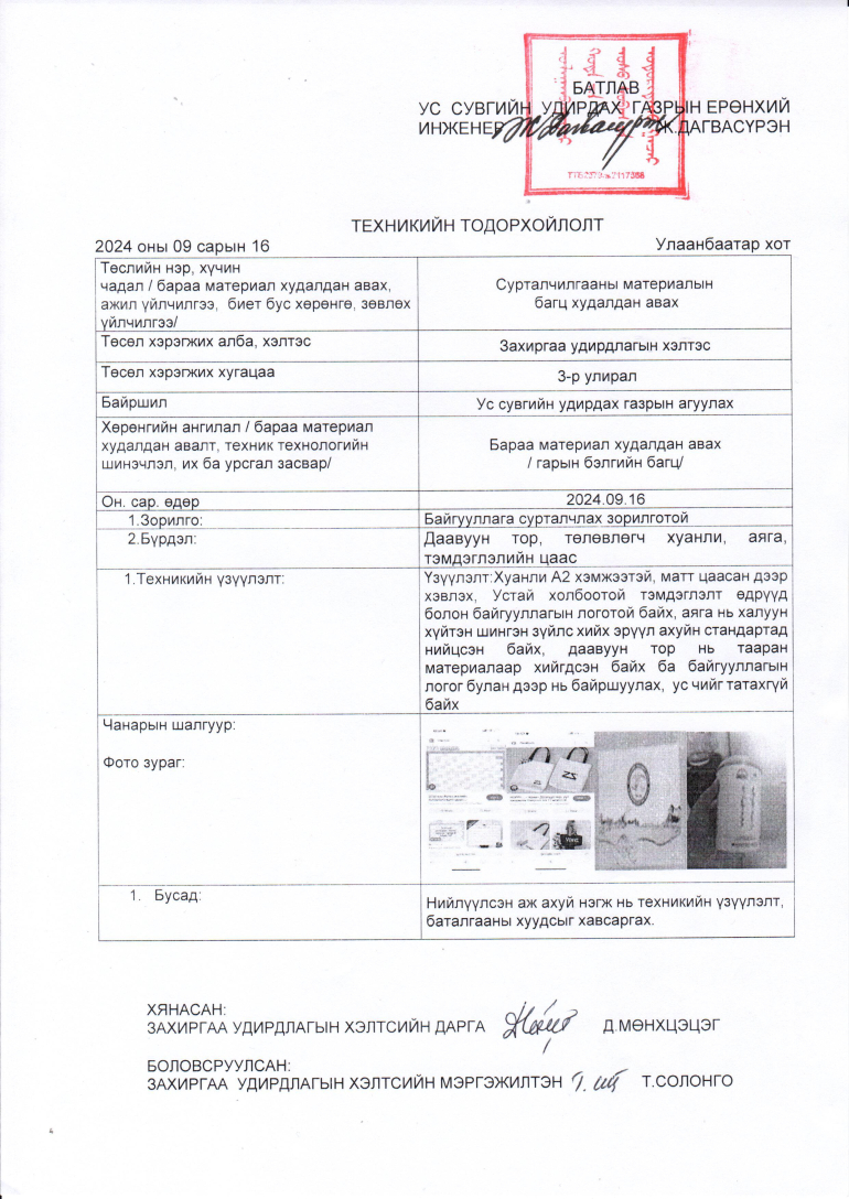 Сурталчилгааны материалын багц 230 иж бүрдлийг худалдан авах. Хавсралтад байгаа техникийн тодорхойлолтын дагуу тухайн барааг нийлүүлэх тухай үнийн санал болон холбогдох мэдээллийг 2024 оны 9 дүгээр сарын 23-ны өдрийн 16 цаг 00 минутаас өмнө доорхи хаягаар ирүүлнэ үү. Хүлээн авагчийн нэр: Хангамжийн хэлтэс, Сонгон шалгаруулалт хариуцсан мэргэжилтэн Р.Батсүрэн,